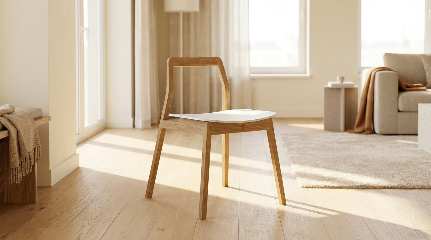 Jídelní židle Nuwa zaujme svým čistým vzhledem a výraznou kombinací přírodního dřeva s moderním recyklovaným materiálem. Sedák je vyroben z hladkého plastu Mínus od Plastic Guys – udržitelného materiálu s jedinečnou kresbou, který dává odpadu novou hodnotu. Každý kus je originál, který vnáší do prostoru osobitý detail.