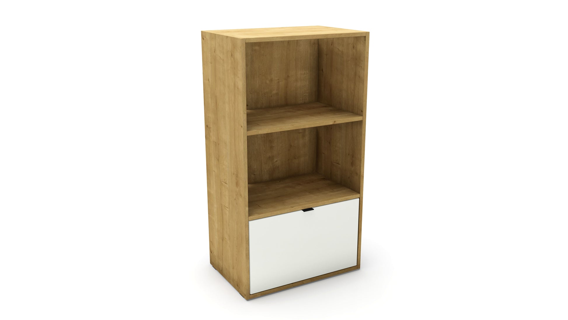 - Skříňka obsahuje: 2 pevné police (horní část), 1 vysokou zásuvku (spodní část)