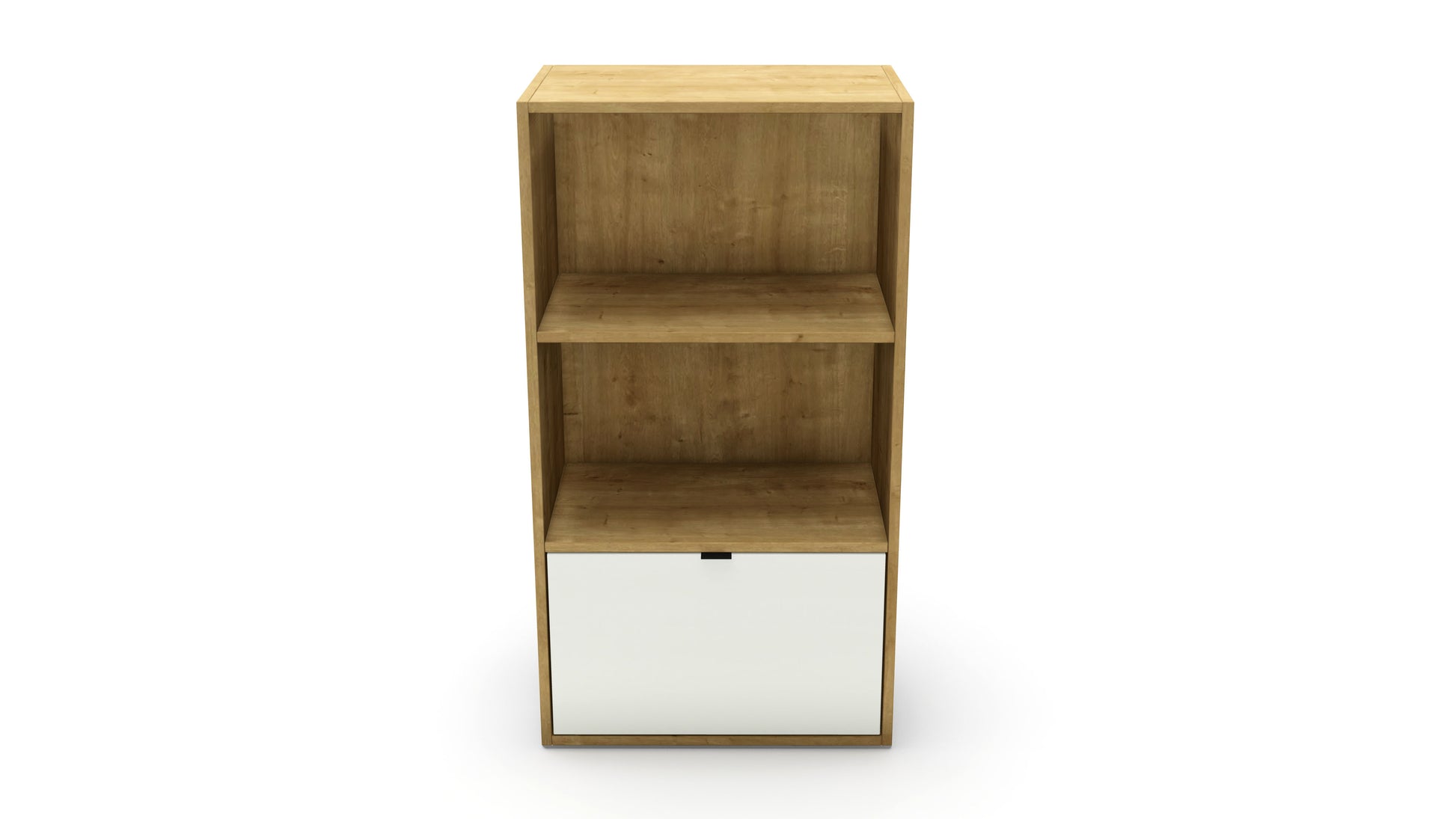 Skříňka z kolekce Typo se dvěma pevnými policemi v horní části a jednou vysokou zásuvkou ve spodní části.