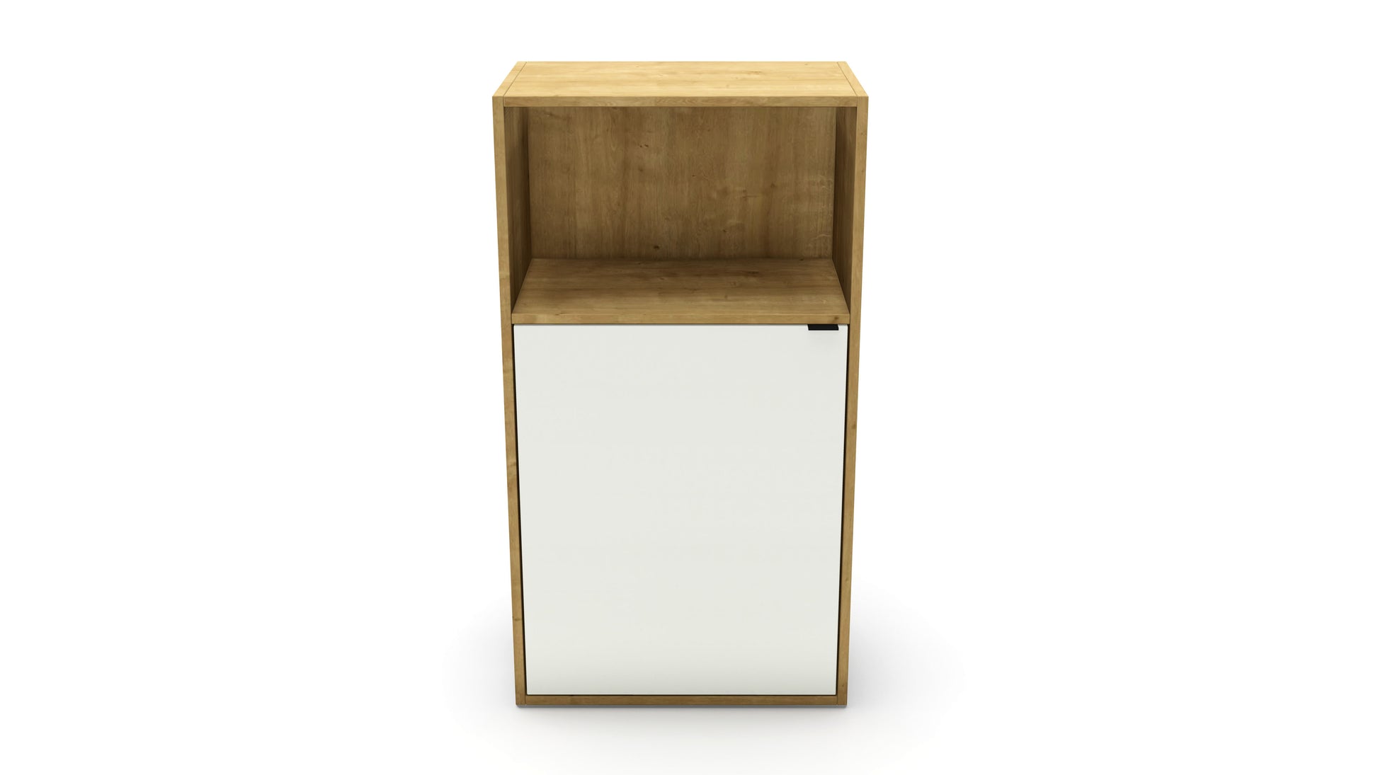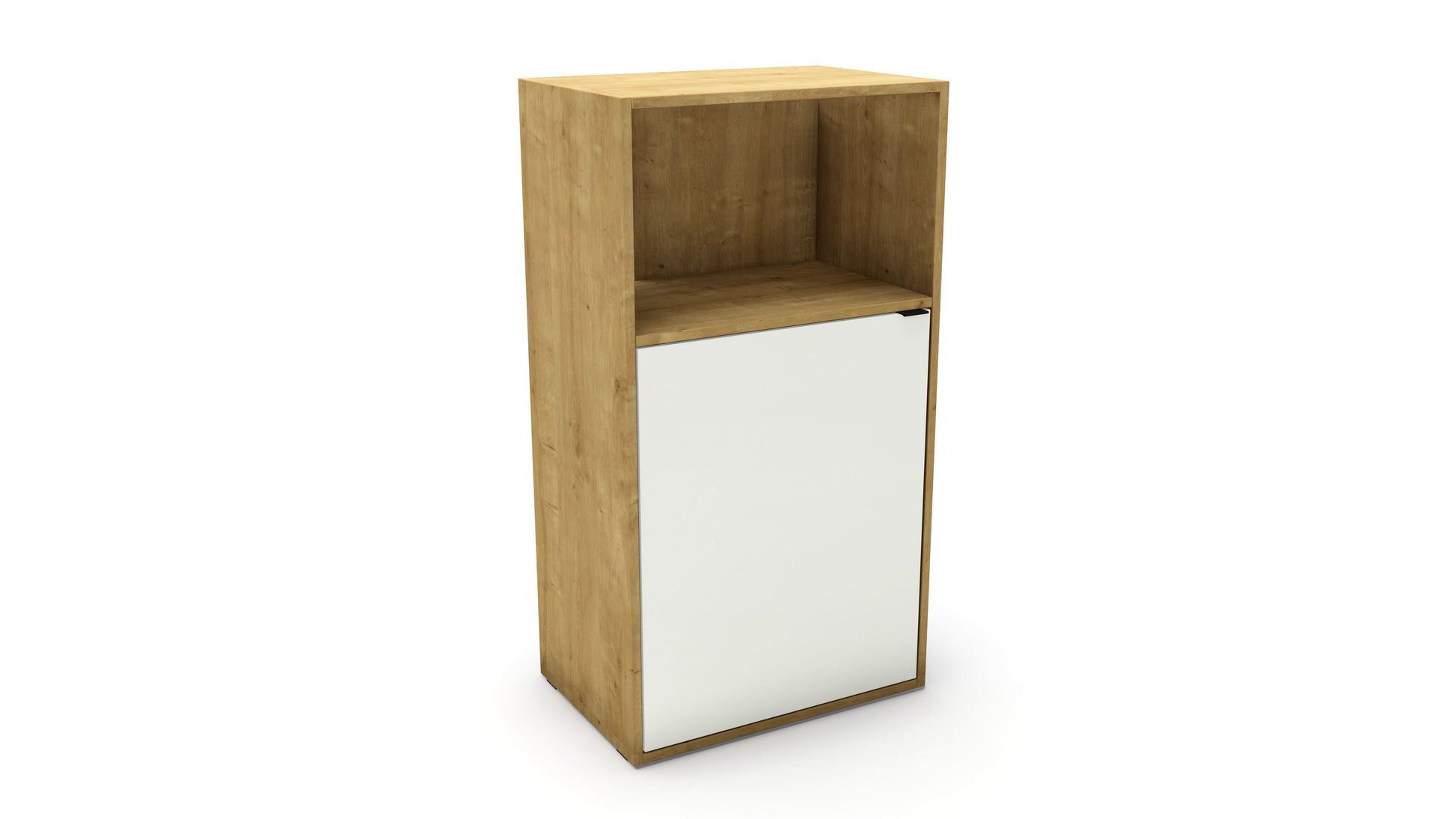 Skříňka z kolekce Typo. Horní část skříňky je otevřená. Dolní část uzavíratelná dvířky je vybavena jednou výškově stavitelnou policí (k dispozici je 5 volitelných pozic).