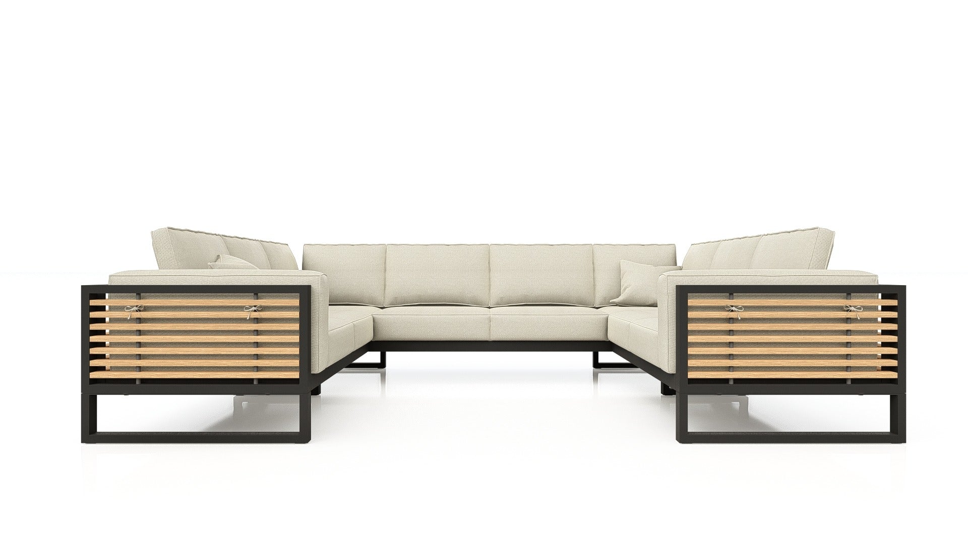 Venkovní sedačka Mowa ve tvaru U nabízí luxusní prostor pro pohodlné posezení i stylový odpočinek pod širým nebem. Kombinuje masivní modřínové dřevo, kovové nožky a kvalitní čalounění do harmonického celku, který působí moderně a zároveň přirozeně. Díky svému tvaru vytváří útulný polootevřený prostor ideální pro společná setkání s rodinou nebo přáteli.