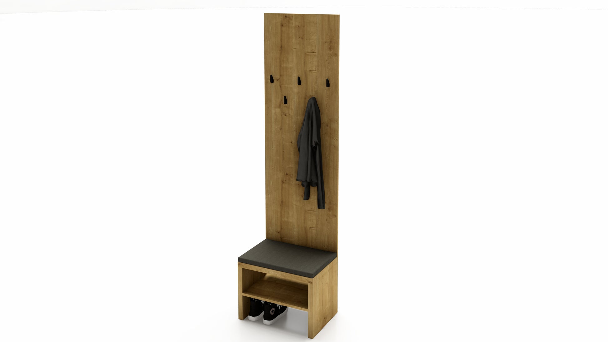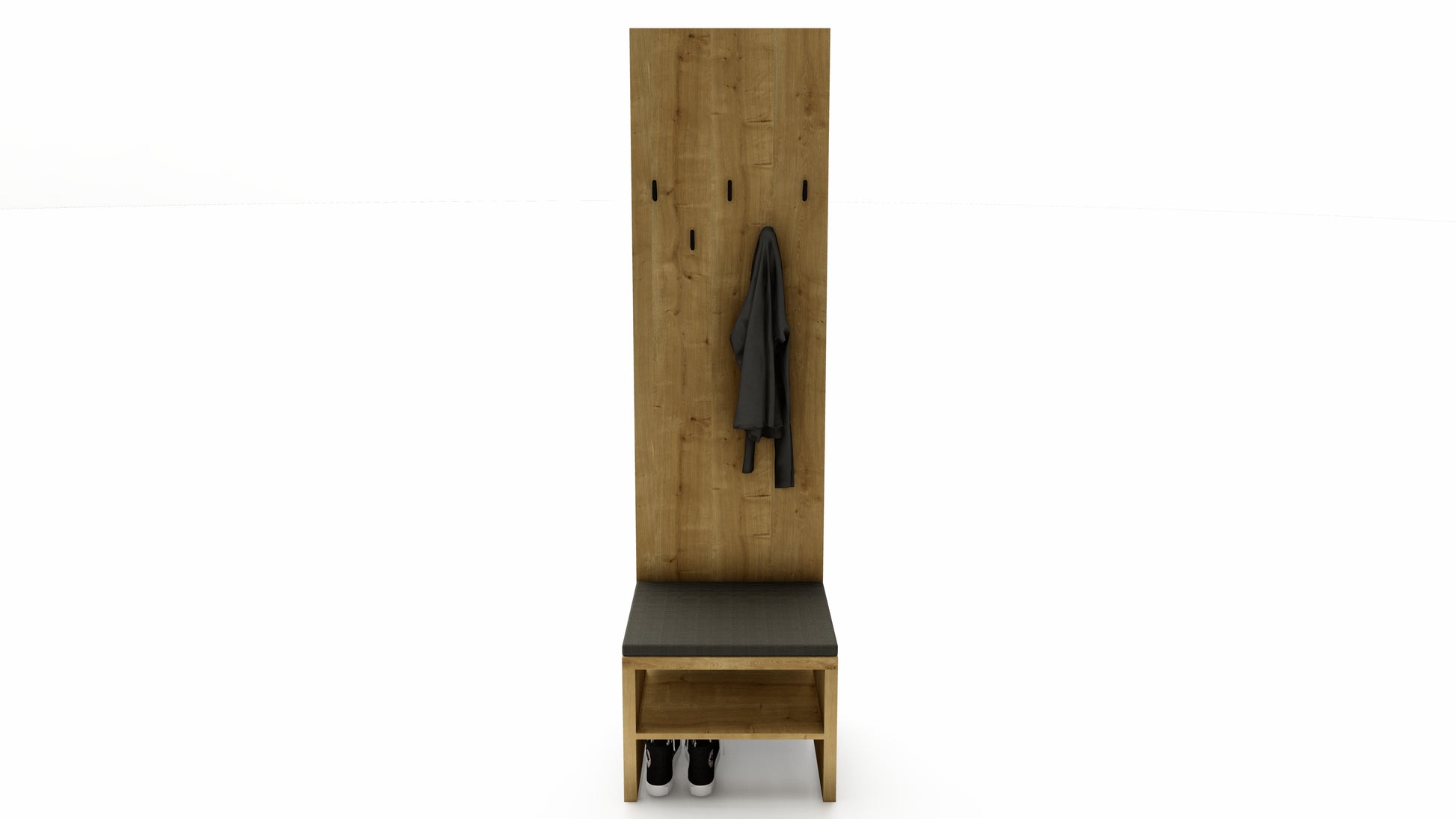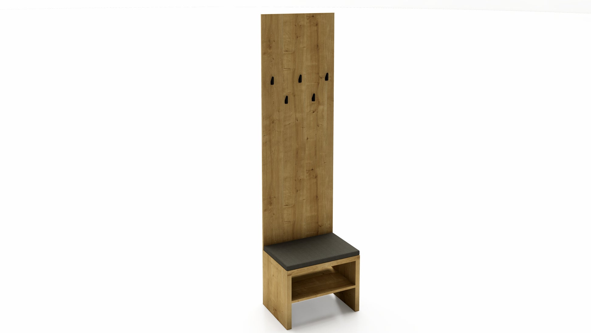 Součástí stěny je lavička s čalouněným sedákem, která nabízí pohodlí při obouvání a zároveň ukrývá prostor pro uložení obuvi či tašek. Šest kovových háčků poskytne dostatek místa pro kabáty, bundy i klobouky, a to jak v domácím, tak ve firemním prostředí.