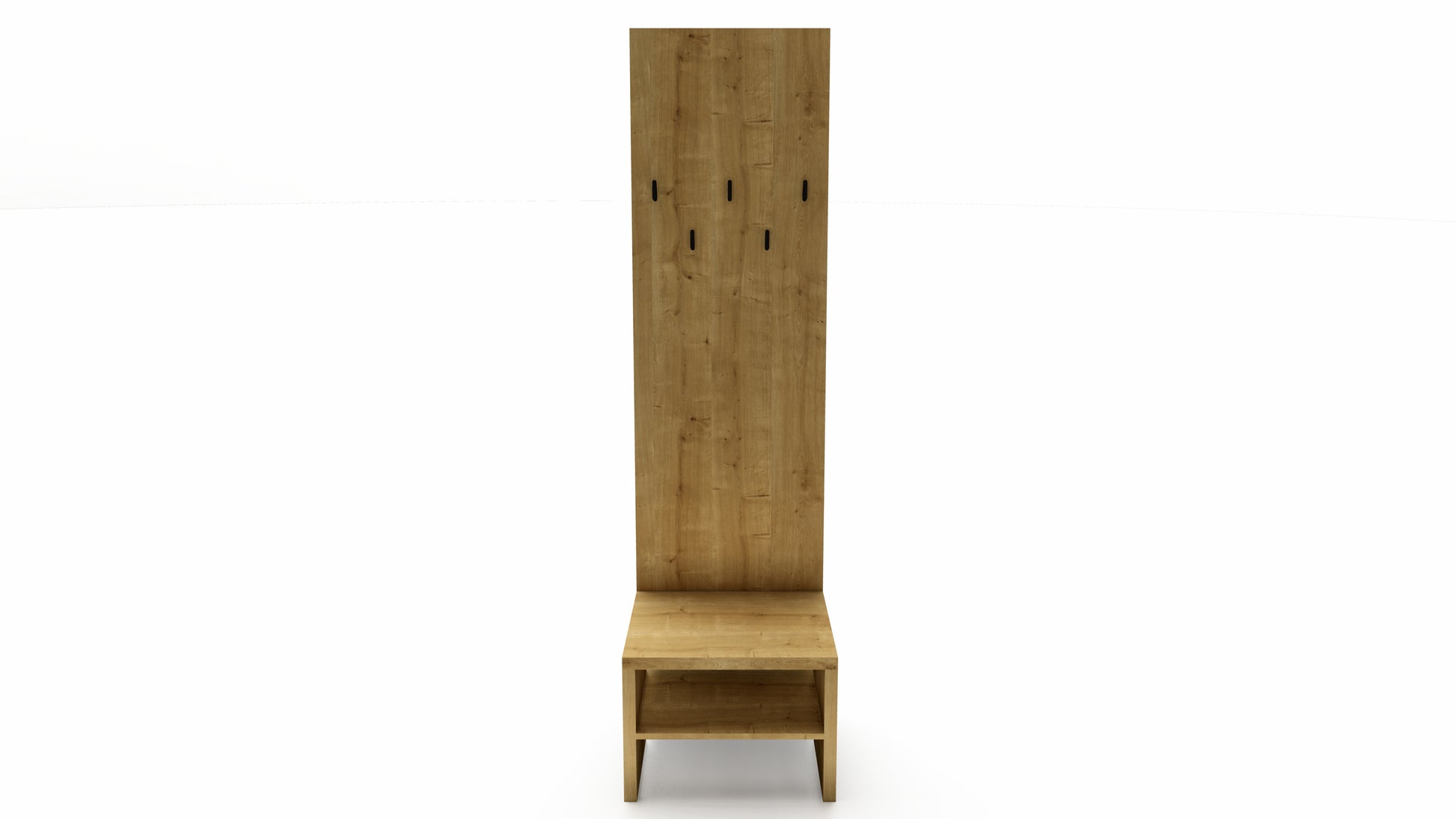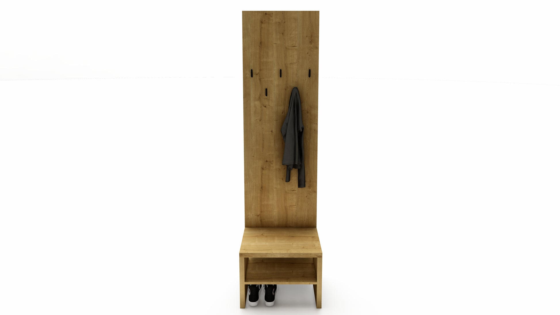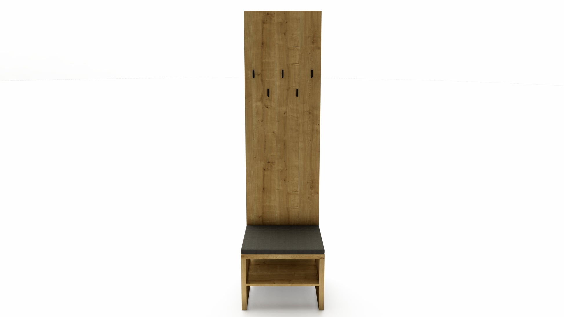 Součástí stěny je lavička s čalouněným sedákem, která nabízí pohodlí při obouvání a zároveň ukrývá prostor pro uložení obuvi či tašek. Šest kovových háčků poskytne dostatek místa pro kabáty, bundy i klobouky, a to jak v domácím, tak ve firemním prostředí.