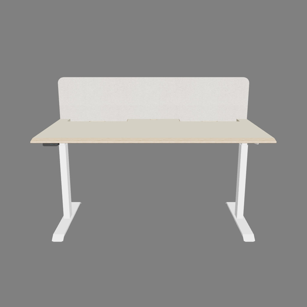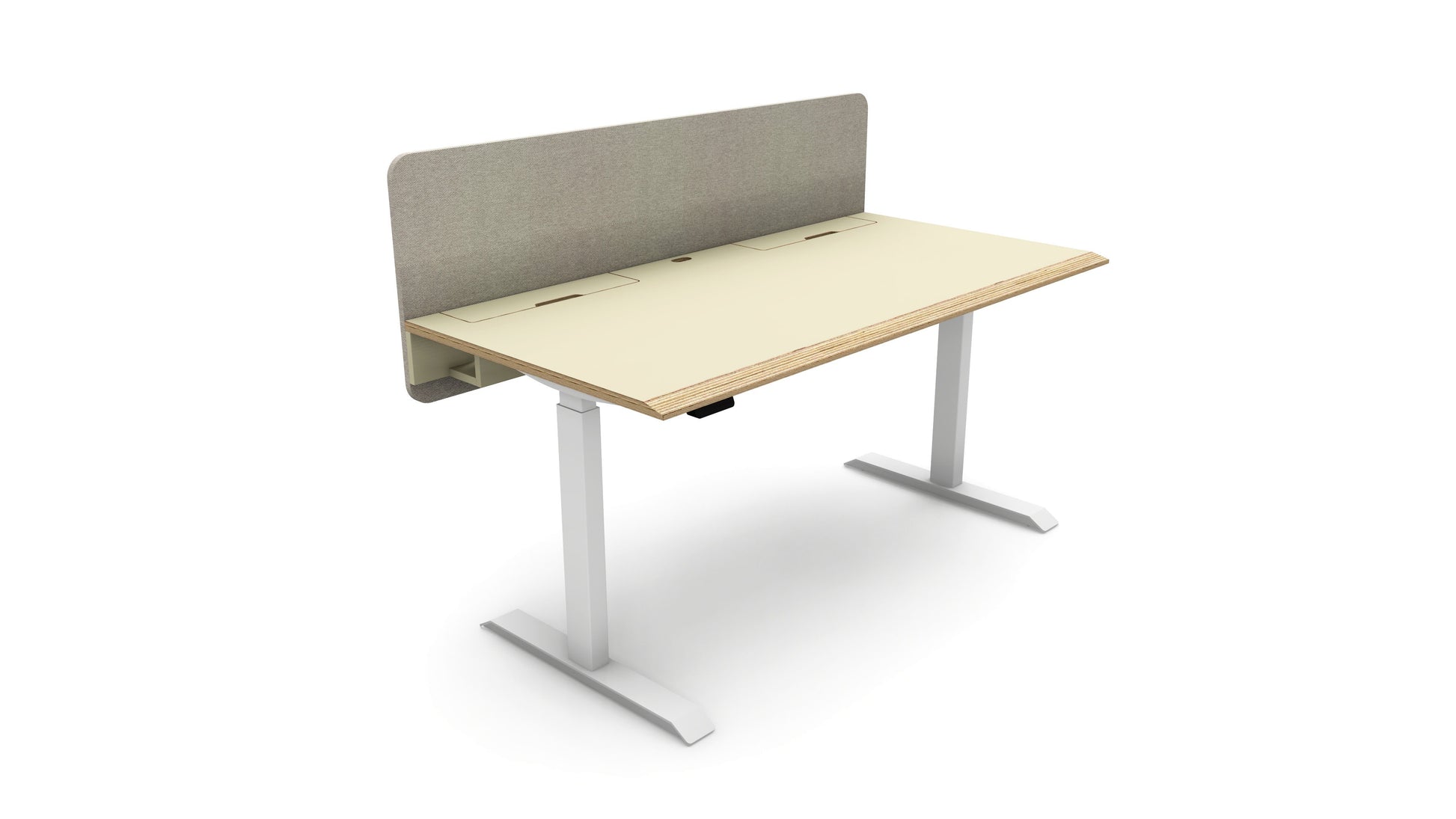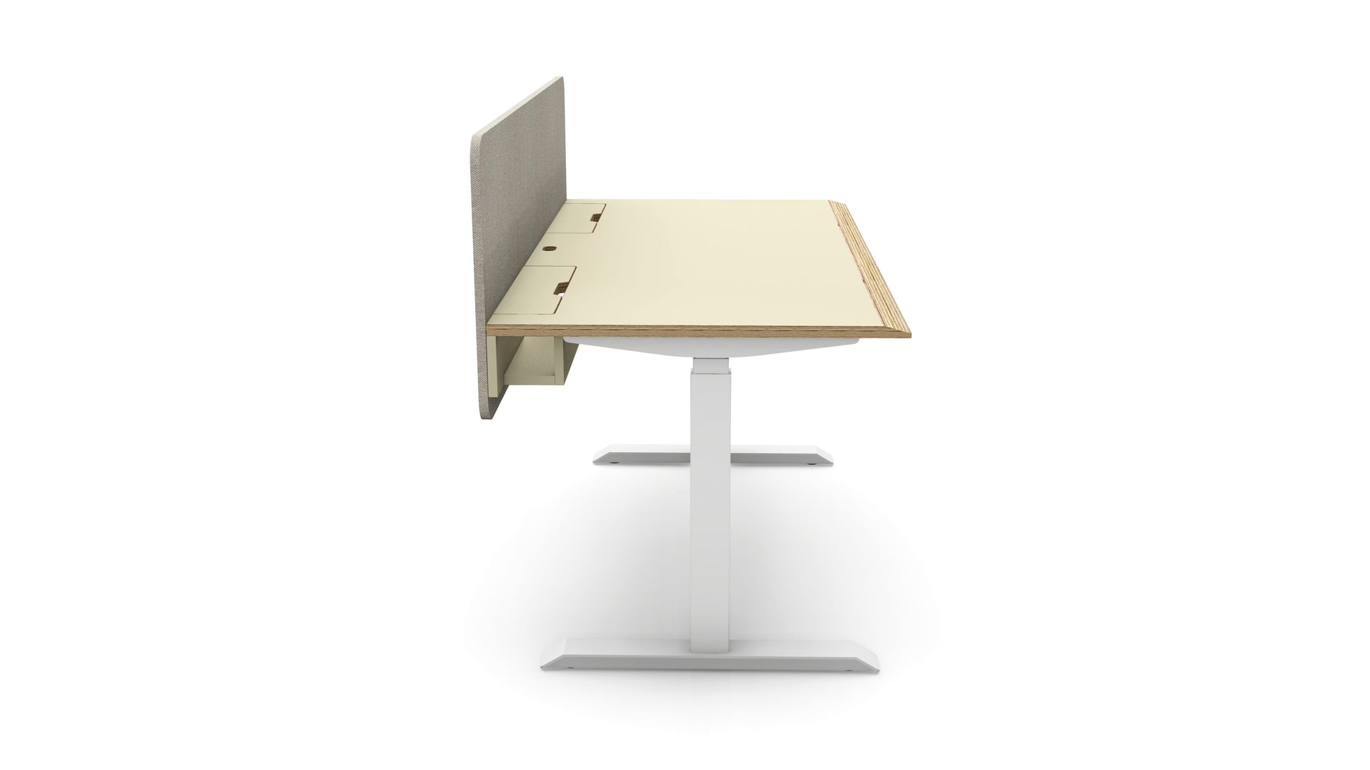 Pracovní deska je vyrobena z kvalitní překližky s HPL povrchem a má pravoúhlé rohy a zkosenou přední hranu, která zajišťuje pohodlí při každodenním používání. Minimalistický design doplňuje čistě řešená kovová podnož s tichým a plynulým chodem při změně výšky.